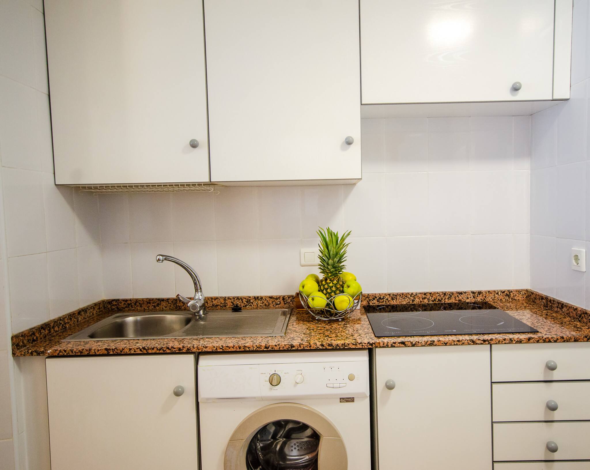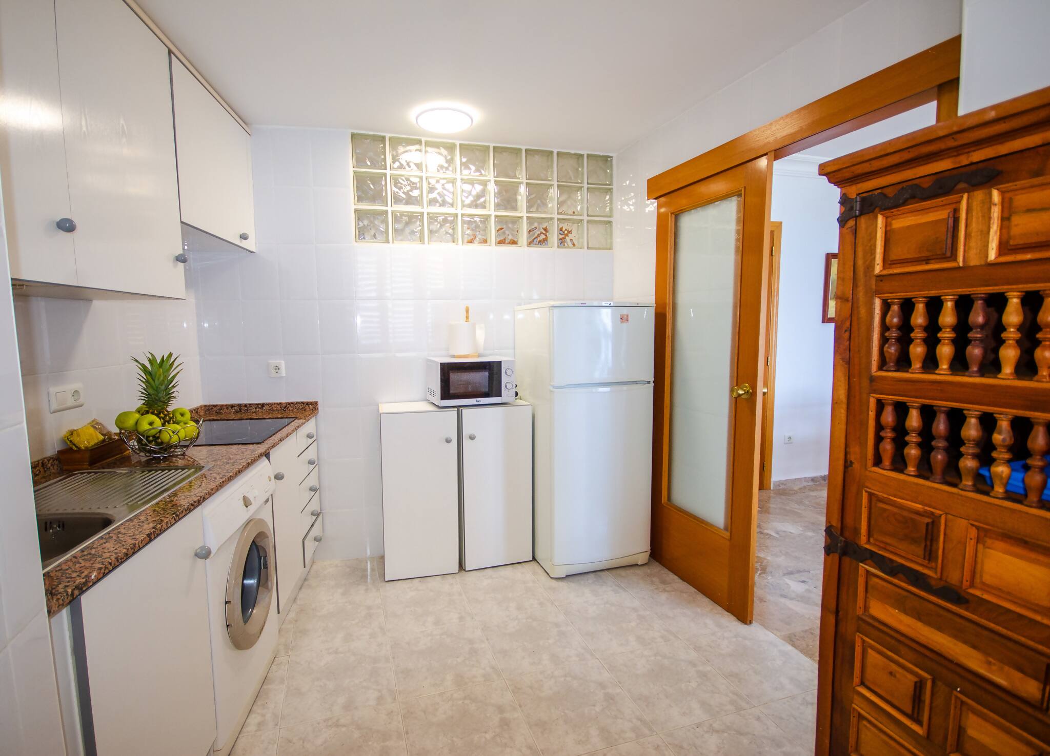 La cocina, totalmente equipada, es un paraíso para los amantes de la gastronomía, donde podrás preparar deliciosas comidas mientras disfrutas de la vista. La habitación principal, con su cama doble.