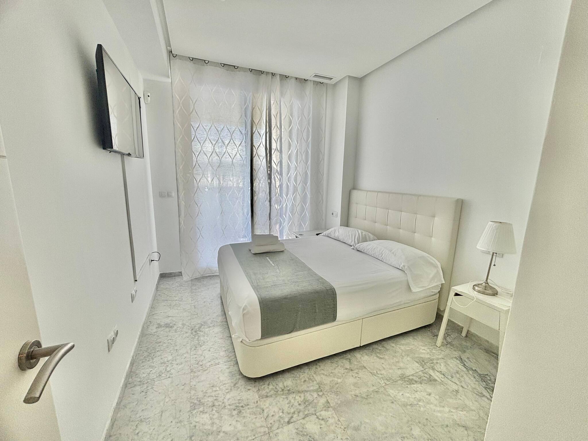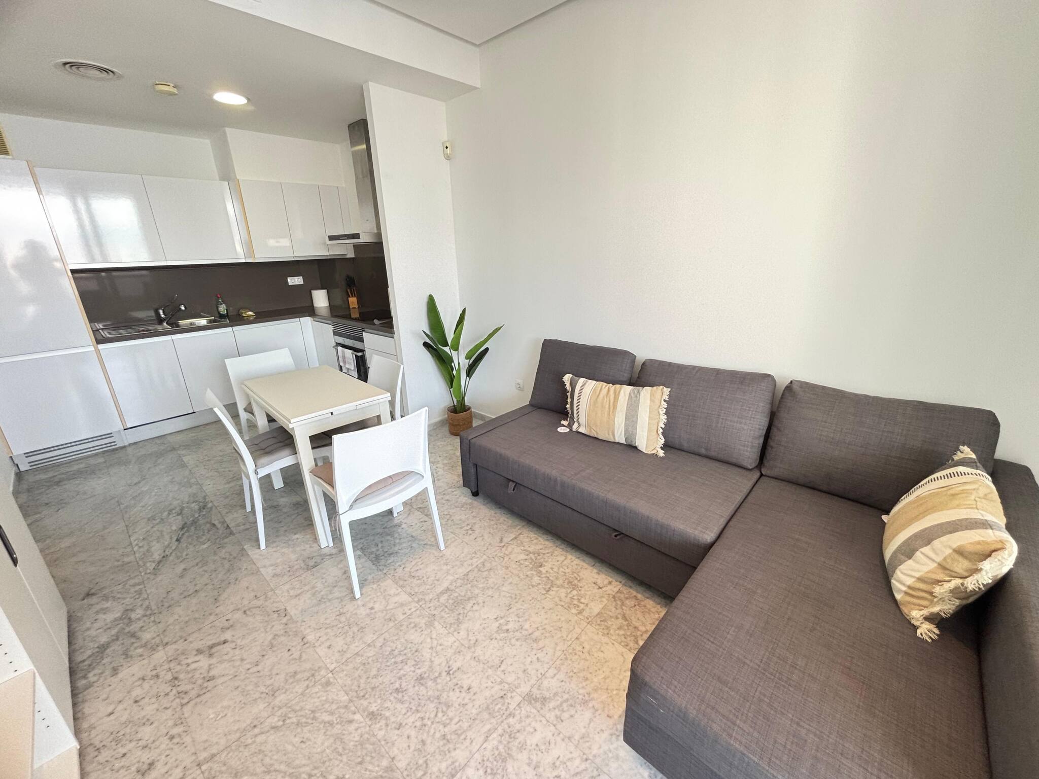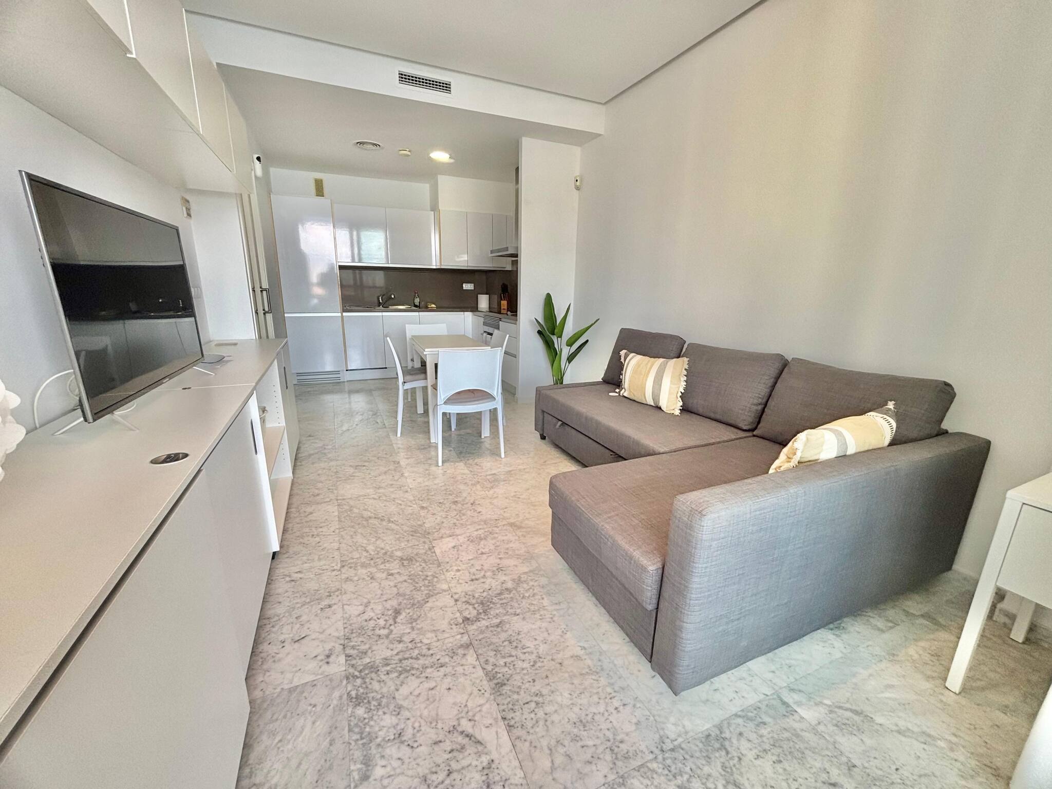 El apartamento cuenta con una acogedora habitación doble, ideal para descansar después de un día de sol y playa. Además, dispone de un cómodo sofá cama, perfecto para recibir a amigos o familiares. La cocina completa está equipada con todo lo necesario para preparar deliciosas comidas, y el baño con ducha ofrece un espacio moderno y funcional.