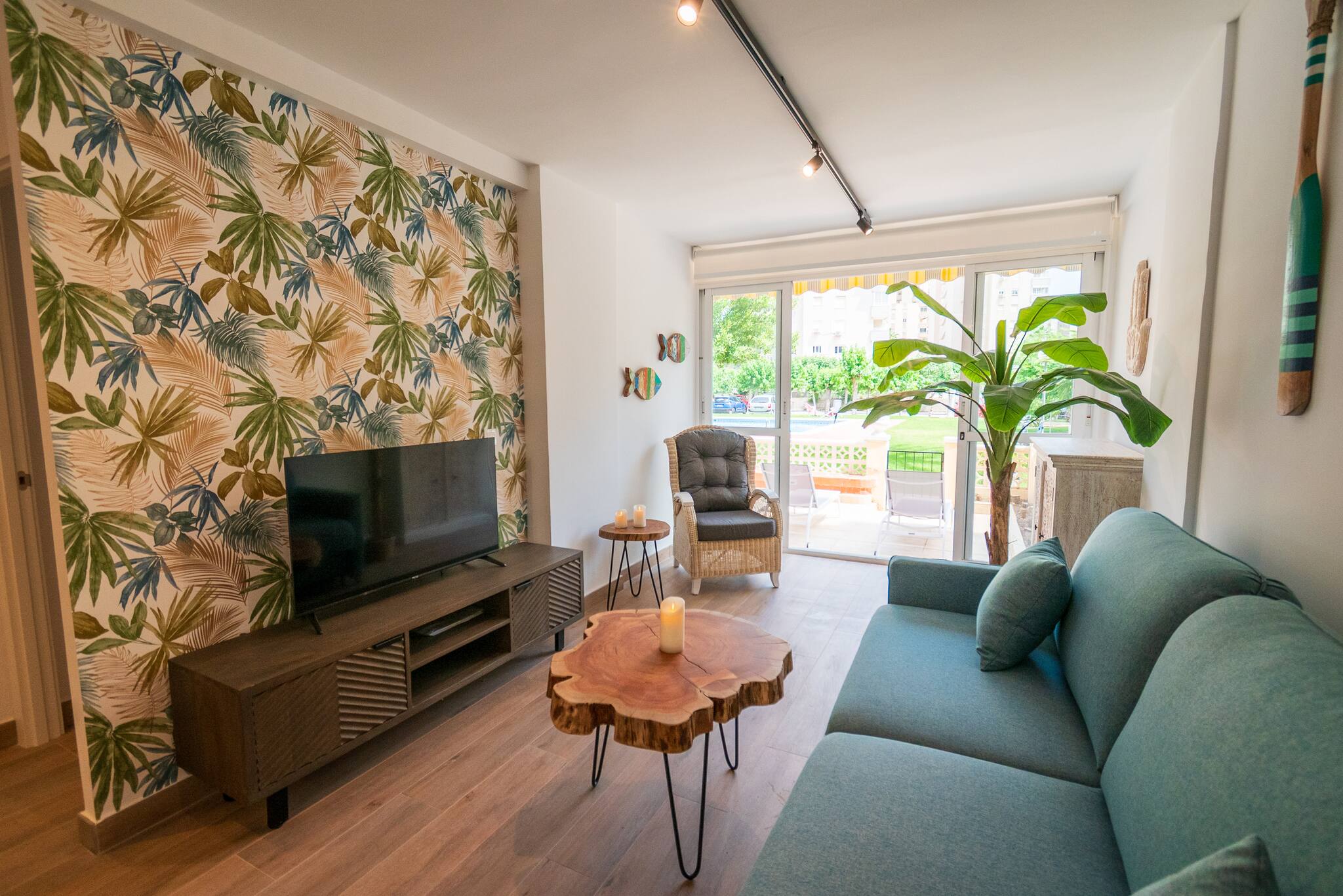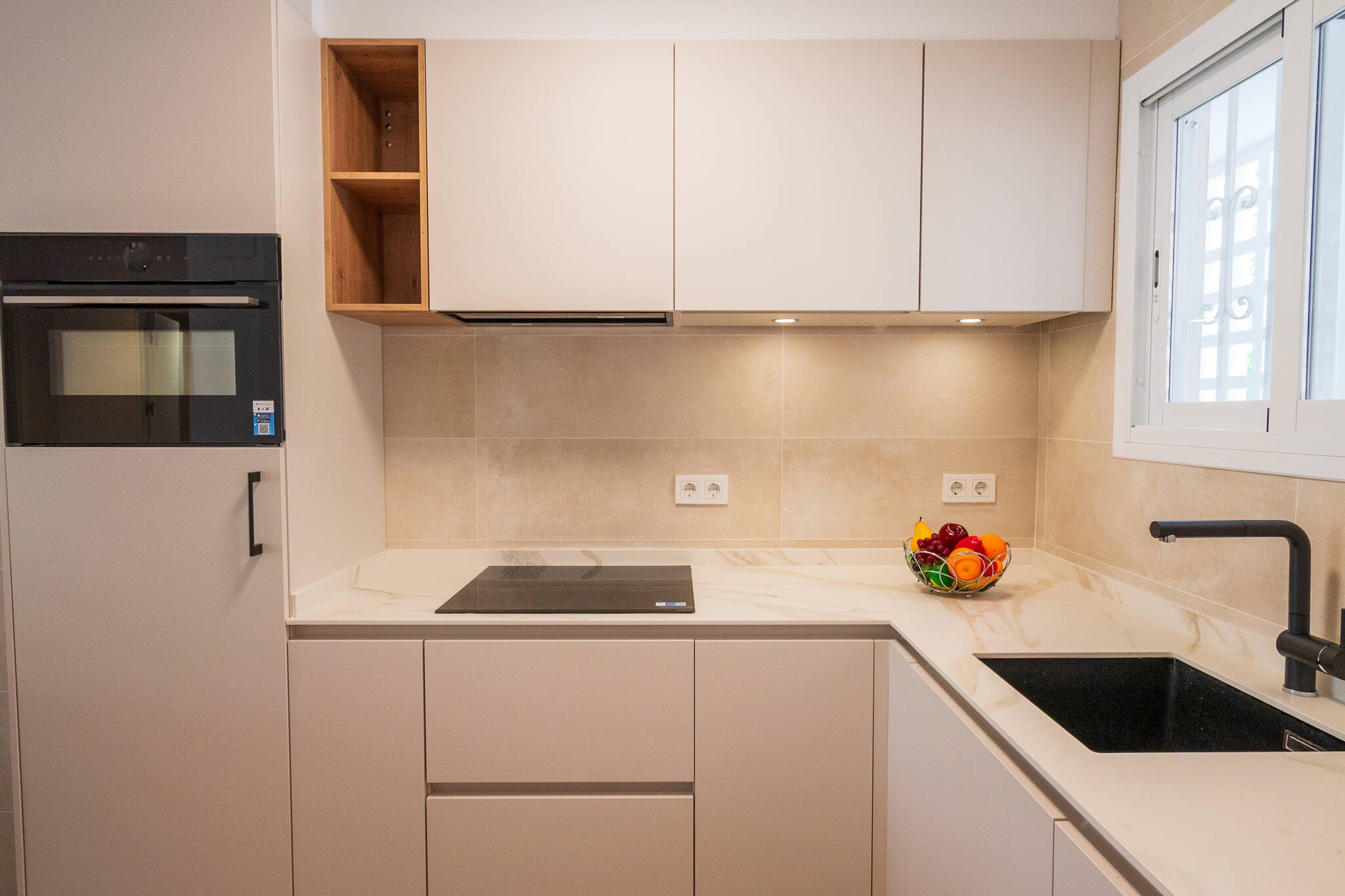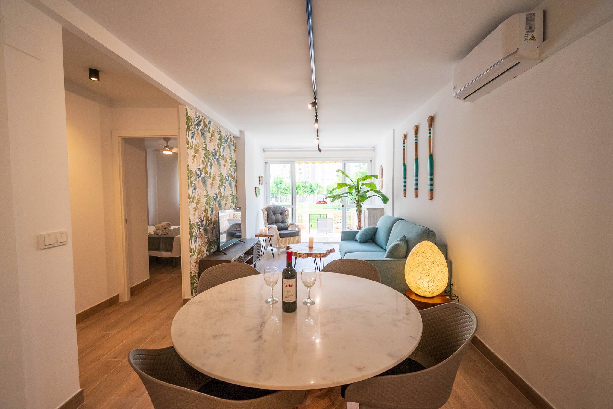 El salón es cómodo y luminoso, equipado con TV y todo lo necesario para relajarte tras un día de playa o piscina. La cocina está completamente equipada, lista para preparar desde tapas rápidas hasta cenas memorables.
