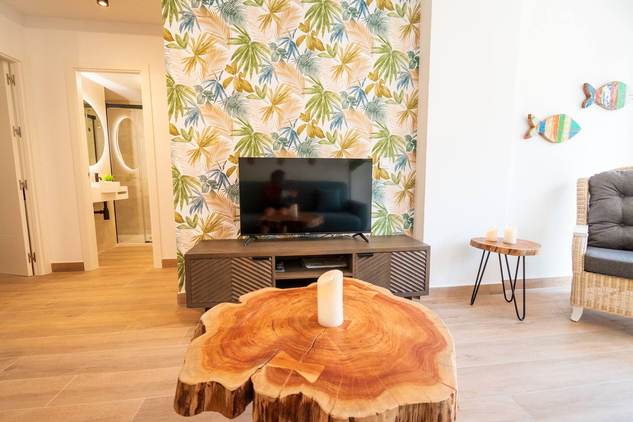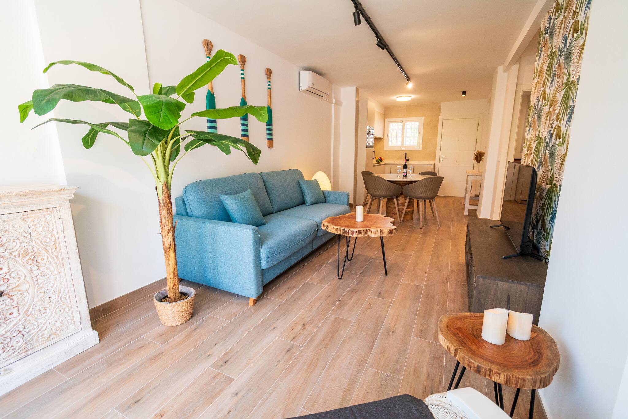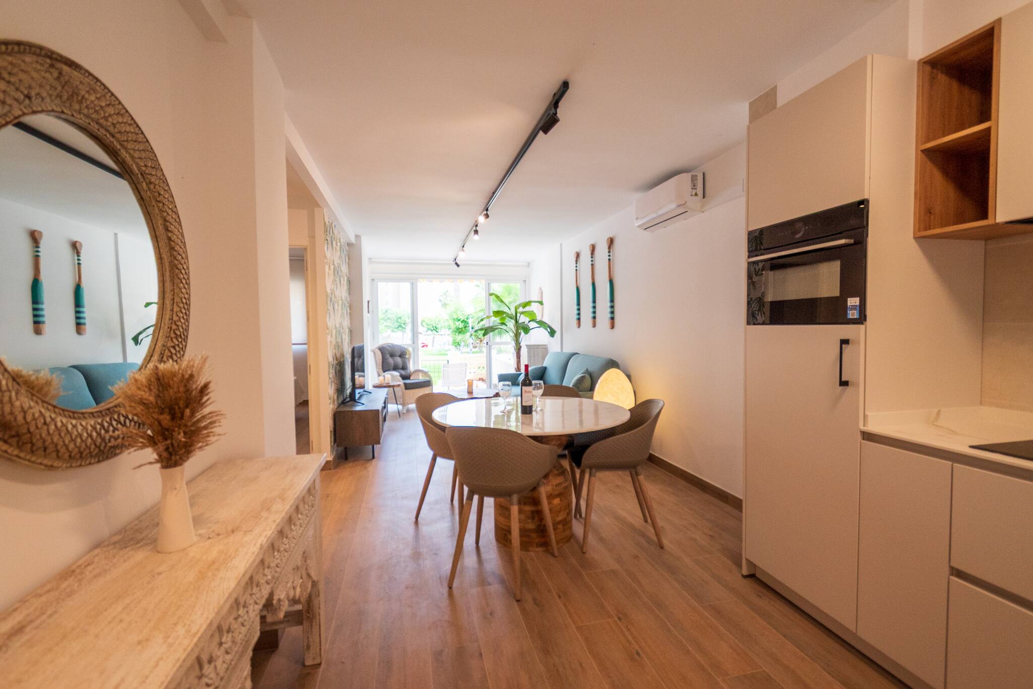 El salón es cómodo y luminoso, equipado con TV y todo lo necesario para relajarte tras un día de playa o piscina. La cocina está completamente equipada, lista para preparar desde tapas rápidas hasta cenas memorables.